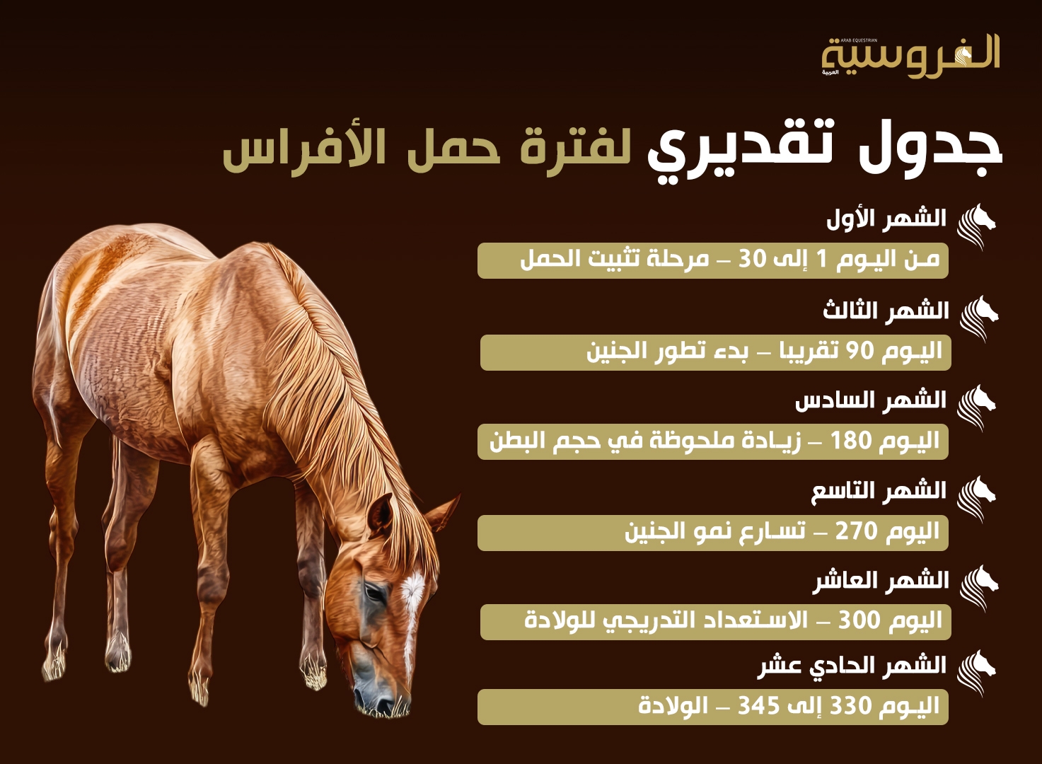 تشير المراجع البيطرية المتخصصة إلى أن متوسط فترة حمل الفرس يتراوح بين 320 و362 يوماً. تلد معظم الأفراس خلال فترة تمتد من 330 إلى 345 يوماً بعد التلقيح الناجح. ورغم أن هذا الإطار الزمني واضح نسبياً، ما زالت تسجل حالات ولادة طبيعية خارج هذا النطاق دون حدوث مضاعفات صحية، وهذا يرجع إلى الطبيعة المتغيرة للحمل عند الخيول. حيث يتأثر طول فترة الحمل بعدة عوامل، من بينها سلالة الفرس، وعمرها، وحالتها الصحية، وأيضاً توقيت التلقيح خلال موسم التزاوج، إضافة إلى جنس المهر. توضح الدراسات أن الأفراس التي تحمل مهوراً ذكوراً قد تمتد فترة حملها أياماً أطول مقارنة بالإناث، مع بقاء الفارق ضمن الحدود الطبيعية.